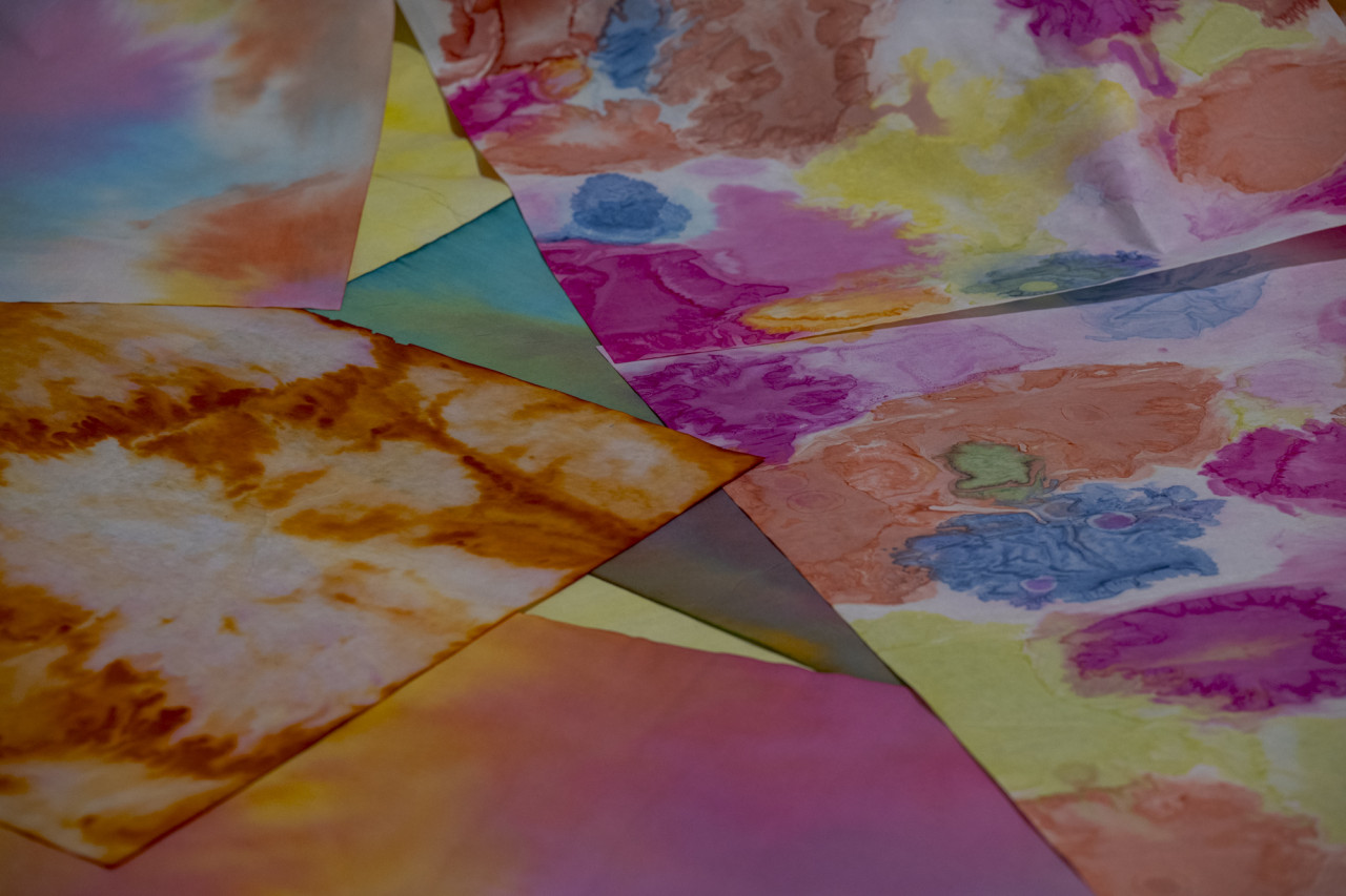 Vornehmlich bedient sich Hanni Schierscher für ihre Arbeiten feiner asiatischer Papiere. Die verwendeten Farben und Tuschen durchdringen das Material vollständig, werden eins mit ihm.