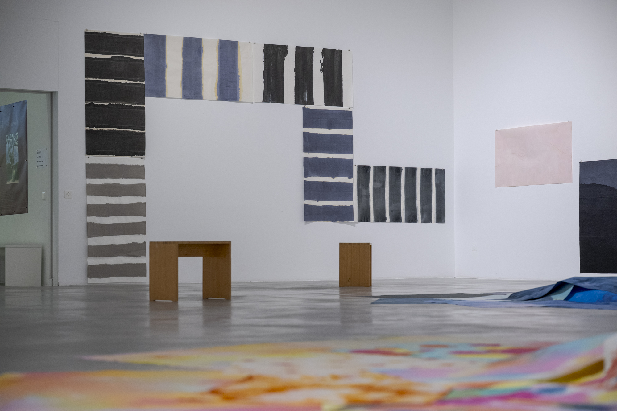 Für das Haus Gutenberg hat Hanni Schierscher 2024 Arbeiten aus Stoff angefertigt, die sie Gesten nennt. Sie wurden in der unmittelbaren Umgebung des Hauses an Bäumen und Sträuchern, an Mauern und auf dem Boden liegend gezeigt – gut sichtbar von den Seminarräumen im Haus. Eine Beziehung wurde hergestellt von innen und aussen, eine Möglichkeit von Haltung gezeigt, die die Abhängigkeit von äusseren Umständen und inneren Befindlichkeiten ermöglicht. Die Stücke waren Wind und Wetter ausgesetzt und werden nun so präsentiert, dass sie das Aussen in den Raum hereinholen.